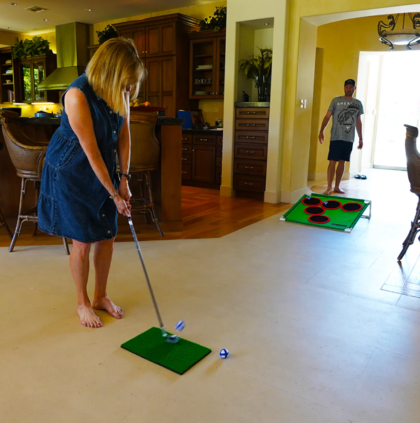 Light plastic balls wrapped in velcro make Golf Pong perfect for garages, basements, offices, and living rooms. Just give yourself a few feet of space.